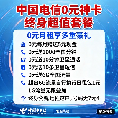 核心福利毫不缩水:0月租终身享,每月5元现金补贴照送,1000分钟全国通话+6G全国流量+卫星通信权益长期有效,转让后新用户也能全额享受。