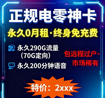 正规无套路!电零神卡永久0月租来袭~ 290G流量+200分钟语音永久享,终身免充费不用续缴,70G定向覆盖主流APP,远程过户轻松办理,特价仅2xxx,市场稀缺正规卡,自用性价比天花板!