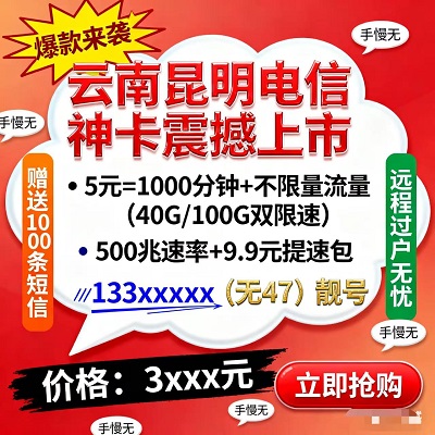 昆明专属福利!5元套餐含1000全国分钟+不限量流量,40G/3M、100G/1M,500兆速率加持~ 赠100条短信,无47靓号,9.9提速包自由,3xxx包远程过户!