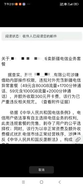 据查实,那里有限公司涉嫌借助内部操作权限,违规对外兜售新疆电信异常套餐(49元含800GB流量+1700分钟通话、59元含1000GB流量+2000分钟通话),并额外收取300元开卡费,该行为已严重违反相关规定。(查看附件证据)