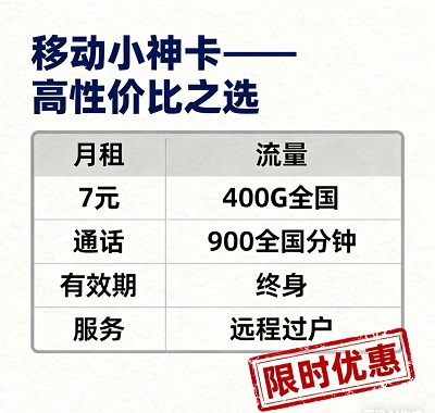 告别流量荒!移动小神卡400G全国流量,刷剧冲浪爽到飞起