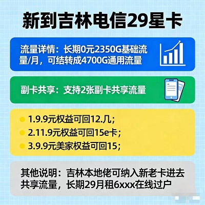 作为吉林本地专属神卡,电信29星卡根本不搞“新用户歧视”!不管你是刚换号的新用户,还是用了几年的电信老用户,只要是吉林本地佬,都能办理或纳入流量共享池,不用换号、不用转网,直接享受29元长期月租+4700G通用流量福利!很多老用户担心换卡麻烦、换号失联,现在完全不用愁,老卡直接加入共享,原号码不变,流量直接升级,既能保留多年手机号,又能享受超大流量和返利权益,吉林本地人的专属优待,这波真的太贴心!